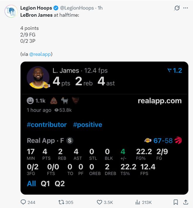 北京时间12月5日,洛杉矶湖人队以123+120击败多伦多猛龙队。最近这两场比赛能看出没有人可以对抗时光老人,对阵太阳一战老詹艰难延续了1297场上双的纪录(10分),可此役老詹上半场9中2,全场比赛17中4+三分5中0,这个纪录终于还是被终结了!但他却传出了绝杀助攻,八村垒三分绝杀,他用自己照耀别人,他无愧是GOAT。